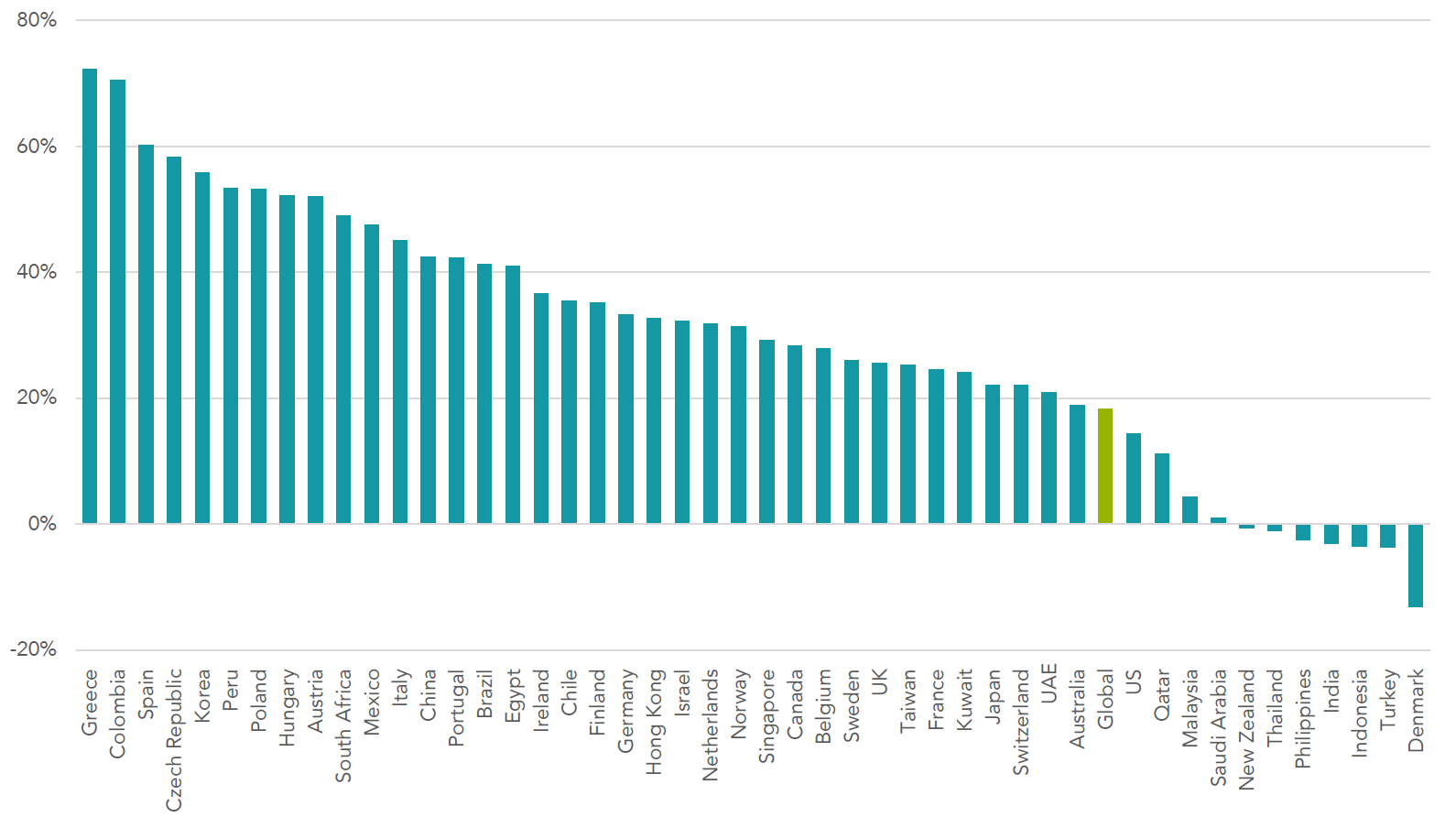 Source: Dimensional Fund Advisors (DFA). Past performance is no guarantee of future results. Country returns are the country component indices of the MSCI All Country World IMI Index for all countries except the United States, where the Russell 3000 Index is used instead. Global is the return of the MSCI All Country World IMI Index. MSCI index returns are net dividend. Indices are not available for direct investment. Their performance does not reflect the expenses associated with the management of an actual portfolio. Frank Russell Company is the source and owner of the trademarks, service marks and copyrights related to the Russell Indexes. MSCI data © MSCI 2025, all rights reserved.