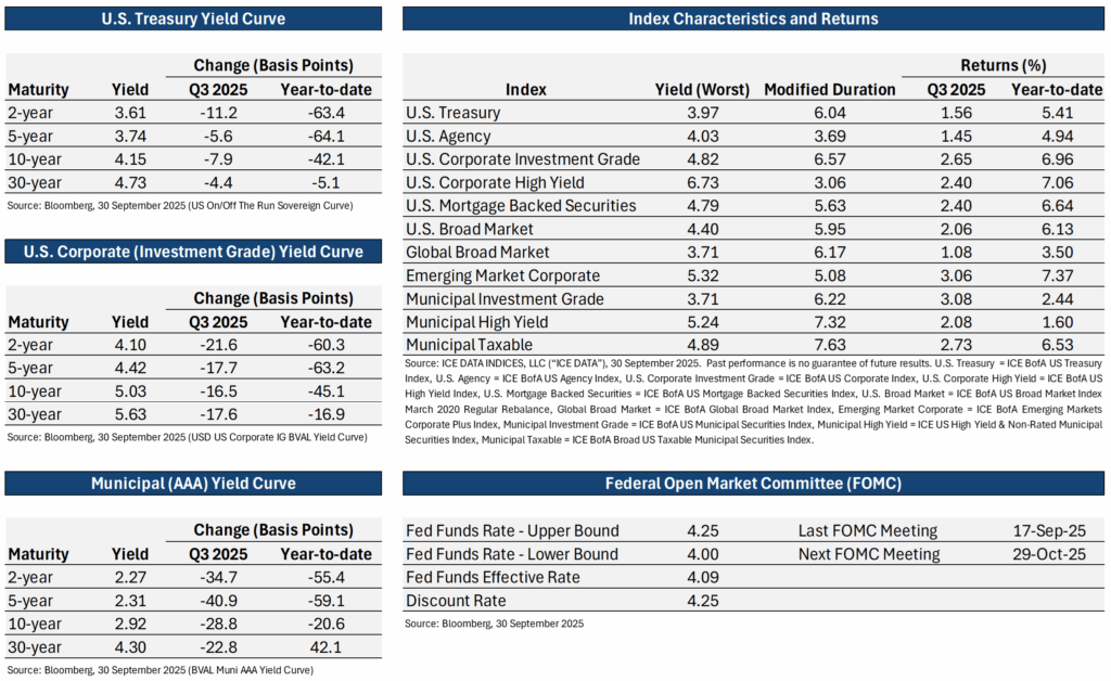 Fixed income performed well in the third quarter, supported by a softening labor market and a 25-basis-point rate cut from the Federal Reserve (Fed). Investment-grade municipal bonds outperformed most fixed income indices in Q3; however, their year-to-date returns continue to lag due to heavy supply and muted performance among longer-duration bonds. Emerging market debt, U.S. high-yield, and U.S. investment-grade corporate bond indices delivered strong quarterly gains and remain the total-return leaders for the year.