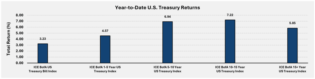 U.S. Treasuries (UST) have faced significant headline risk in 2025, from fears of resurging inflation and rising deficits to a Moody’s downgrade that stripped the U.S. of its last remaining AAA rating. Yet Treasuries have held up well, particularly in the five to 15-year part of the curve. While shorter-duration USTs have also performed solidly, year-to-date returns have lagged their longer counterparts as yields in this segment fell sharply after the Fed began cutting rates in 2024, as shown in the chart below.