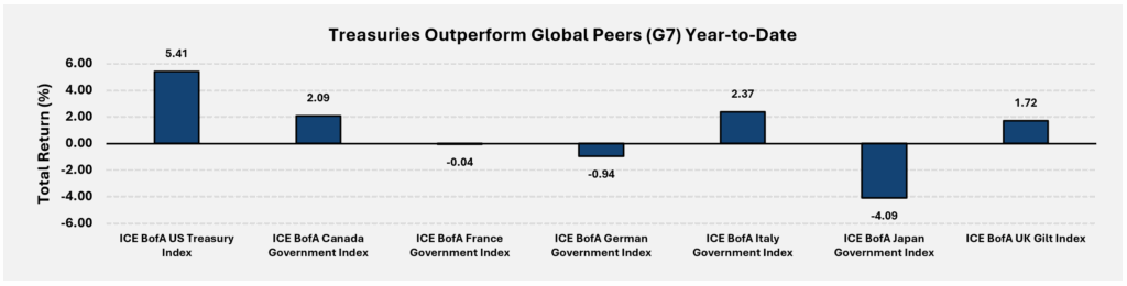 UST performance has also stood out relative to other major government bond markets. Year-to-date, USTs have outperformed their G7 peers on a local currency basis, benefiting from higher starting yields and sustained investor confidence in U.S. credit quality, as shown in the chart below. As the world’s largest and most liquid government bond market, USTs continue to anchor the global financial system and can play an important role in diversified fixed income portfolios.