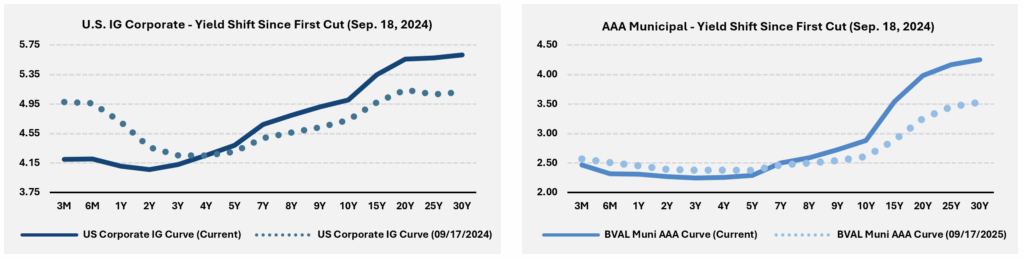 Despite 125 basis points (bps) in cumulative rate cuts since the Fed began easing last year, yields have moved higher across longer maturities in both U.S. investment-grade corporate bonds and AAA-rated municipals. For example, the yield on the 30-year tenor of the U.S. Corporate IG BVAL Yield Curve has risen 50 bps from 5.11% to 5.61% over this period, while AAA-rated municipals have increased by more than 72 bps. This contrasts sharply with the decline in yields observed on shorter bonds. The result is a compelling opportunity to capture additional yield further out on the curve, while also reinforcing the value of diversifying duration exposure to help manage reinvestment risk.