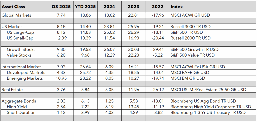 Looking at year-to-date performance through the third quarter, global markets are on pace to beat last year’s stellar figures. But unlike last year, international markets continue to be the primary drivers of returns in 2025. But they’re not the only winners we may be seeing. As interest rates fell, we have also seen small-cap stocks outperforming their larger counterparts in the third quarter. This trend may continue as the Fed maintains its accommodative stance.