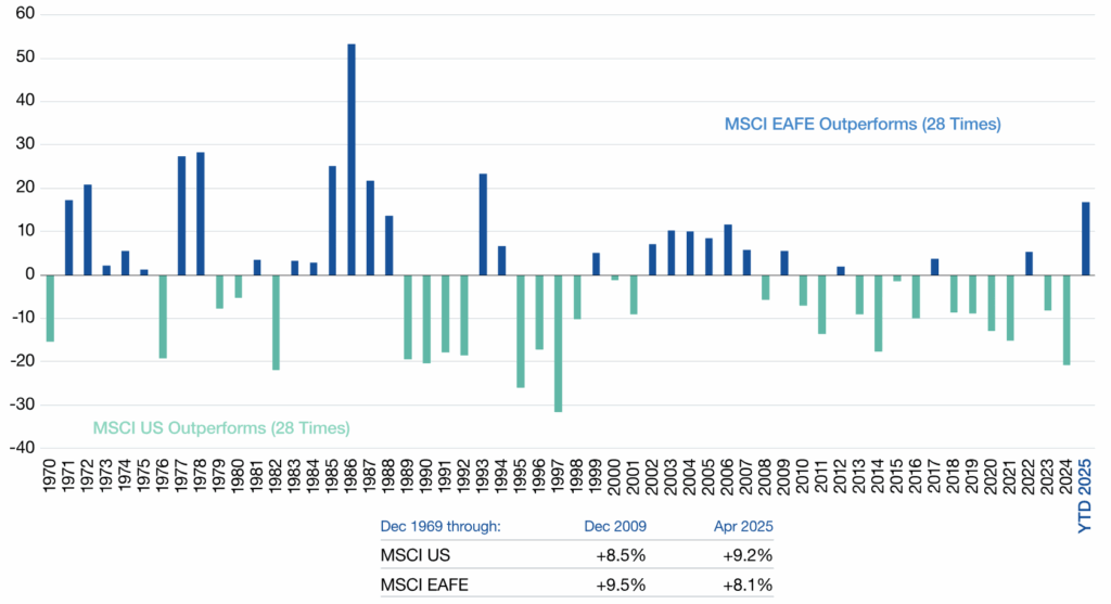 MSCI EAFE – MSCI U.S. Total Return Annual Difference Since 1970