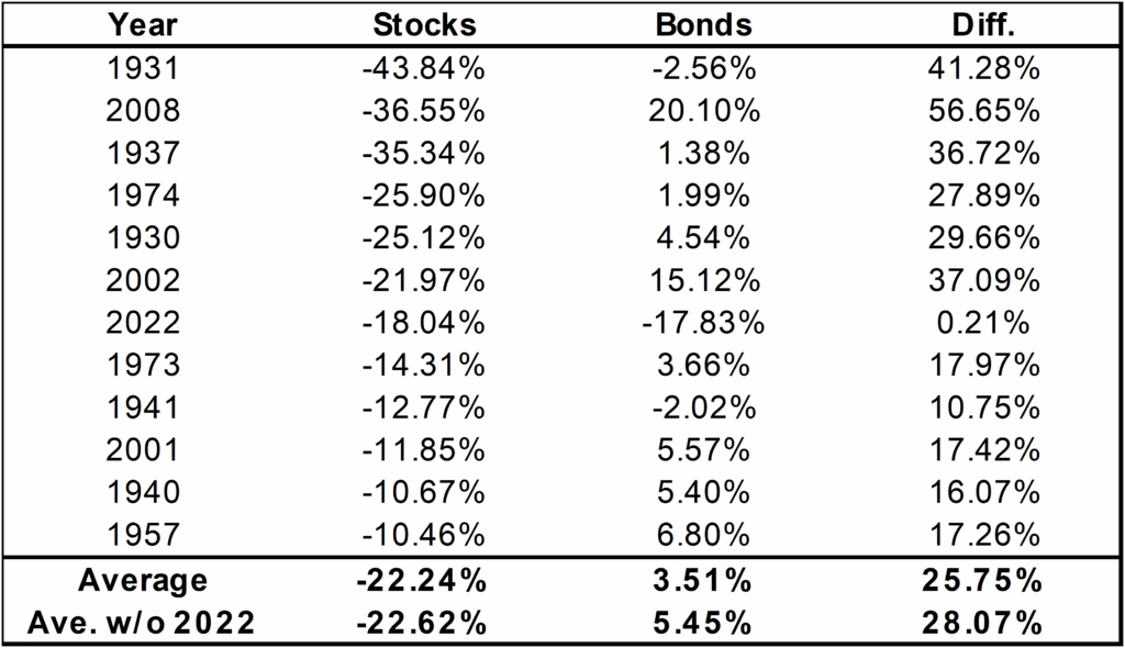 - Is 2022 an Outlier? There were three instances where both stocks and bonds were negative. Two of those still maintained a double-digit difference between stock returns. Thus, 2022 does appear to be a unique situation, but could it happen again? Of course, anything is possible in the markets. But the data would suggest that probabilities are in favor of bonds protecting stocks during years with significant market drops.
