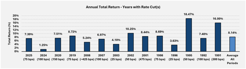 Lower rates often translate into higher bond prices, and an additional two rate cuts from the Fed would likely provide a tailwind for fixed income total returns in 2026. While past performance is no guarantee of future results, for every calendar year over the last 25 that had at least one rate cut, the Bloomberg Aggregate Bond Index had a positive return, as illustrated in the chart below.