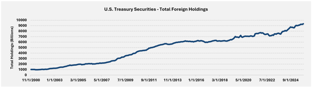 Recent Bloomberg news articles have reported Chinese regulators advised financial institutions to reduce and/or limit future purchases of U.S. Treasury (UST). While this has garnered attention in the news cycle, China’s holdings of UST have been steadily declining since 2013. Rather than representing a fundamental shift, this announcement appears to reinforce a well-established trend. Importantly, total foreign holdings of U.S. debt have been steadily increasing, which should help allay fears of an imminent yield spike due to a foreign buyer strike, as illustrated in the chart below. While rising U.S. debt levels and interest costs pose long-term challenges, the U.S. Treasury market remains the world’s largest and most liquid, serving as the bedrock of the global financial system.