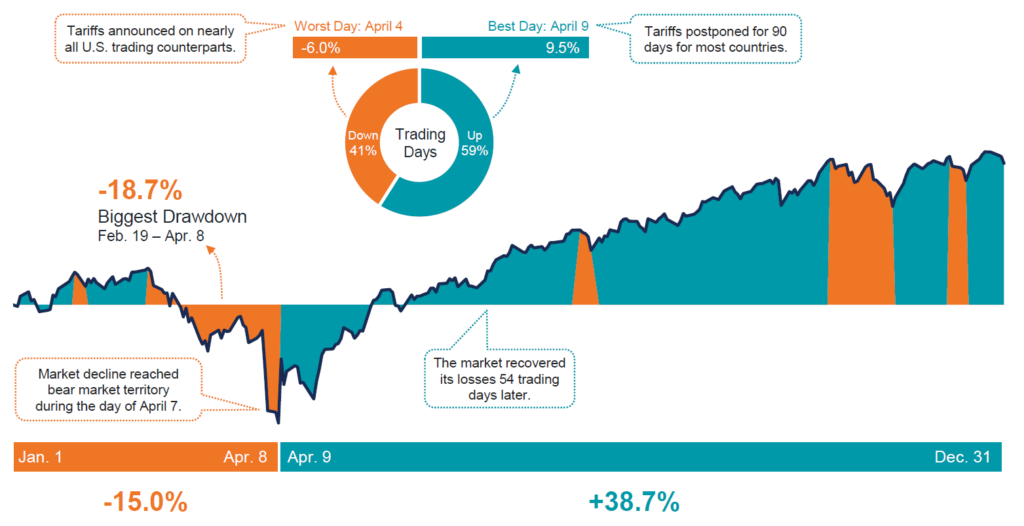 - Rough Start. While it may seem like a distant memory,perhaps one of the most impactful reminders of 2025 is the market reached “bear market” territory (a drop of 20% or more) on April 7, primarily due to tariff announcements. April 4 was one of the worst days in history with the market dropping 6% in one day.