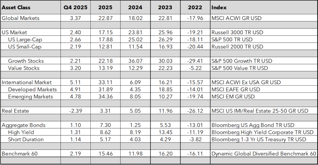 As we look back on 2025, it’s worth reflecting on how stupendous the stock market performed. The U.S. market was up nearly 18% (as measured by the S&P 500), making it the third year in a row of close-to or more than 20% returns. That said, international markets were the darlings of 2025, finishing the year with over a 33% return. And bonds delivered commendable returns at more than 7%. Overall, it was a good year to be a diversified investor.