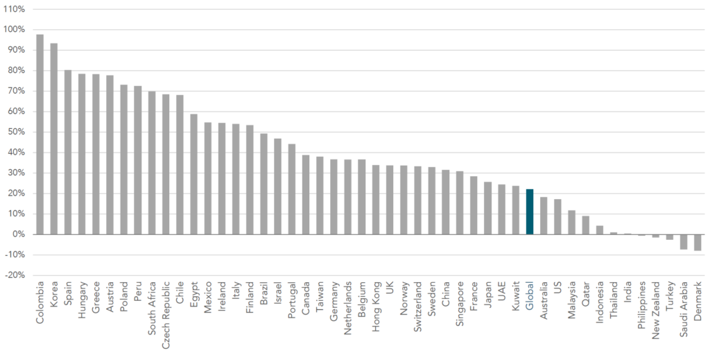 Source: Dimensional Fund Advisors (DFA). Past performance is not a guarantee of future results. Country returns are the country component indices of the MSCI All Country World IMI Index for all countries except the United States, where the Russell 3000 Index is used instead. Global is the return of the MSCI All Country World IMI Index. MSCI index returns are net dividend. Indices are not available for direct investment. Their performance does not reflect the expenses associated with the management of an actual portfolio. Frank Russell Company is the source and owner of the trademarks, service marks and copyrights related to the Russell Indexes. MSCI data © MSCI 2026, all rights reserved.