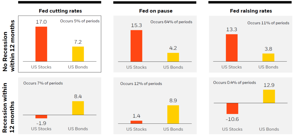 Stock and Bond Market Returns in Various Rate and Recession Backdrops